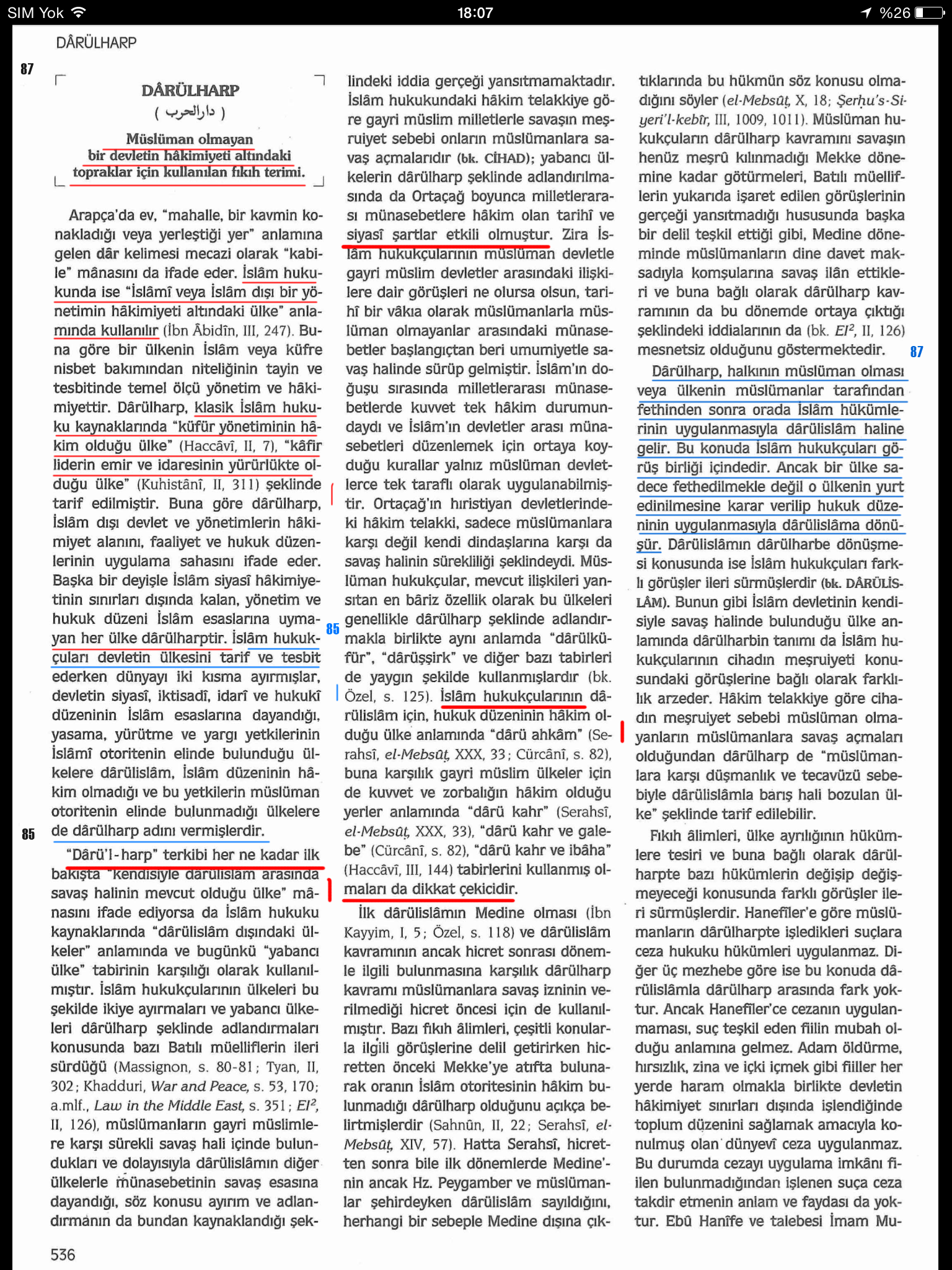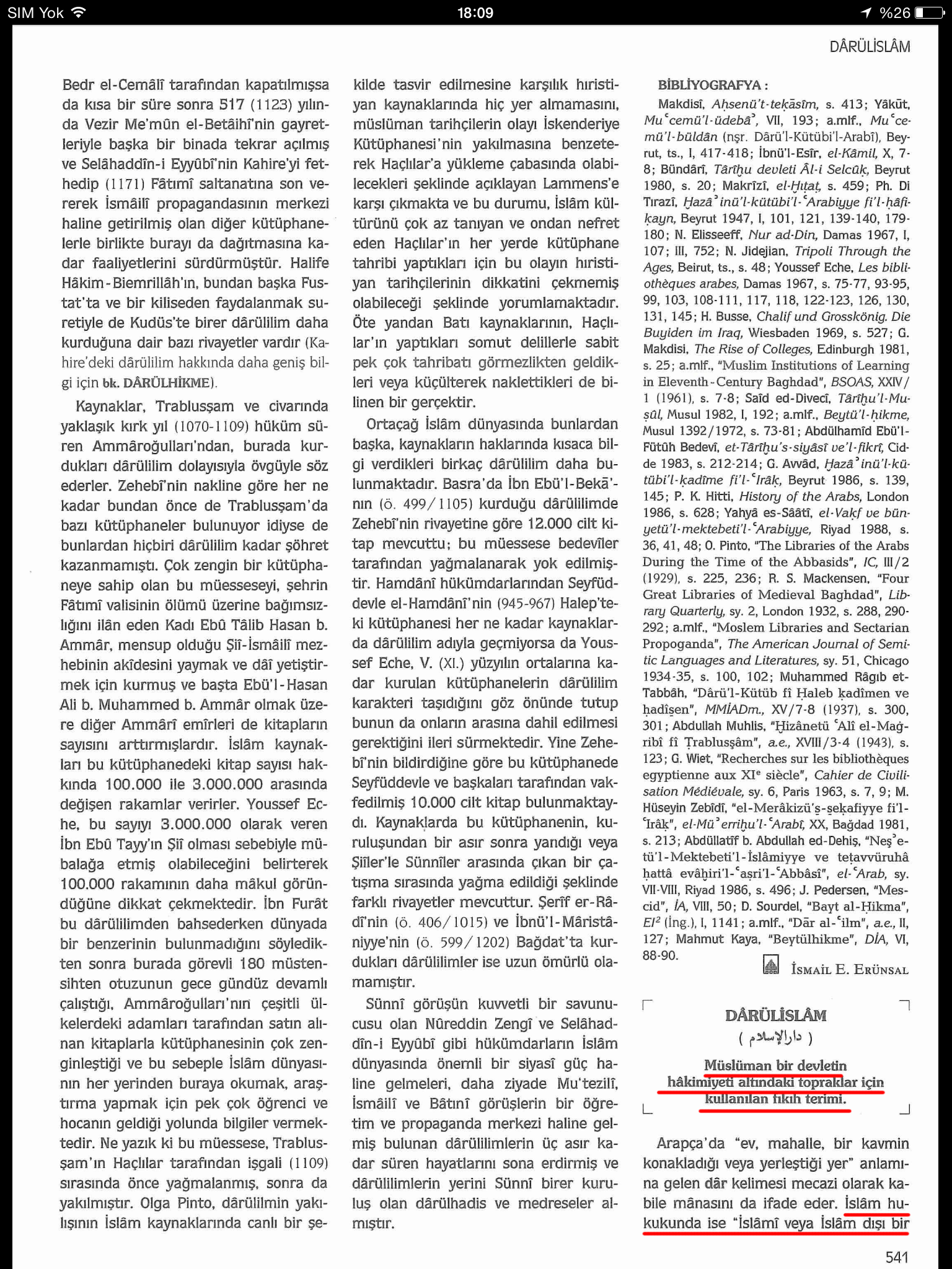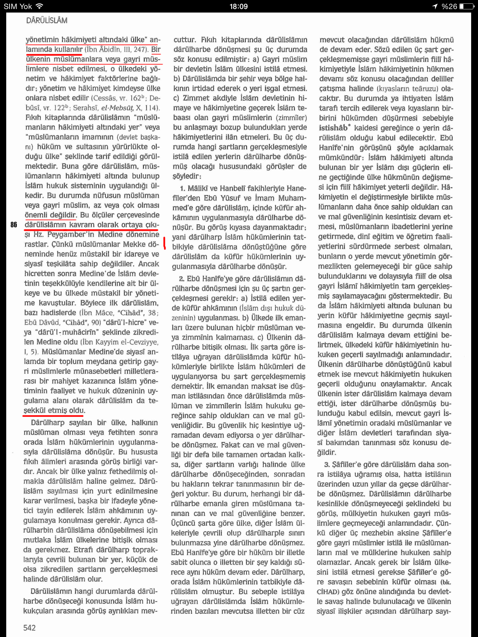 - “Vatandaşlarının [tebeasının] inanlarına göre bir ülkenin müslimân ya da hırıstiyan olduğu belirlenir [tâyin edilir]. Bu açıdan [nokta-i nazardan] bakıldığı zamân Türkiye nüfûsunun büyük çoğunluğunun [kâhir ekseriyyetinin] müslîman olması nedeniyle [sebebiyle] bir İslâm ülkesidir [daru’l-islâmdır].
